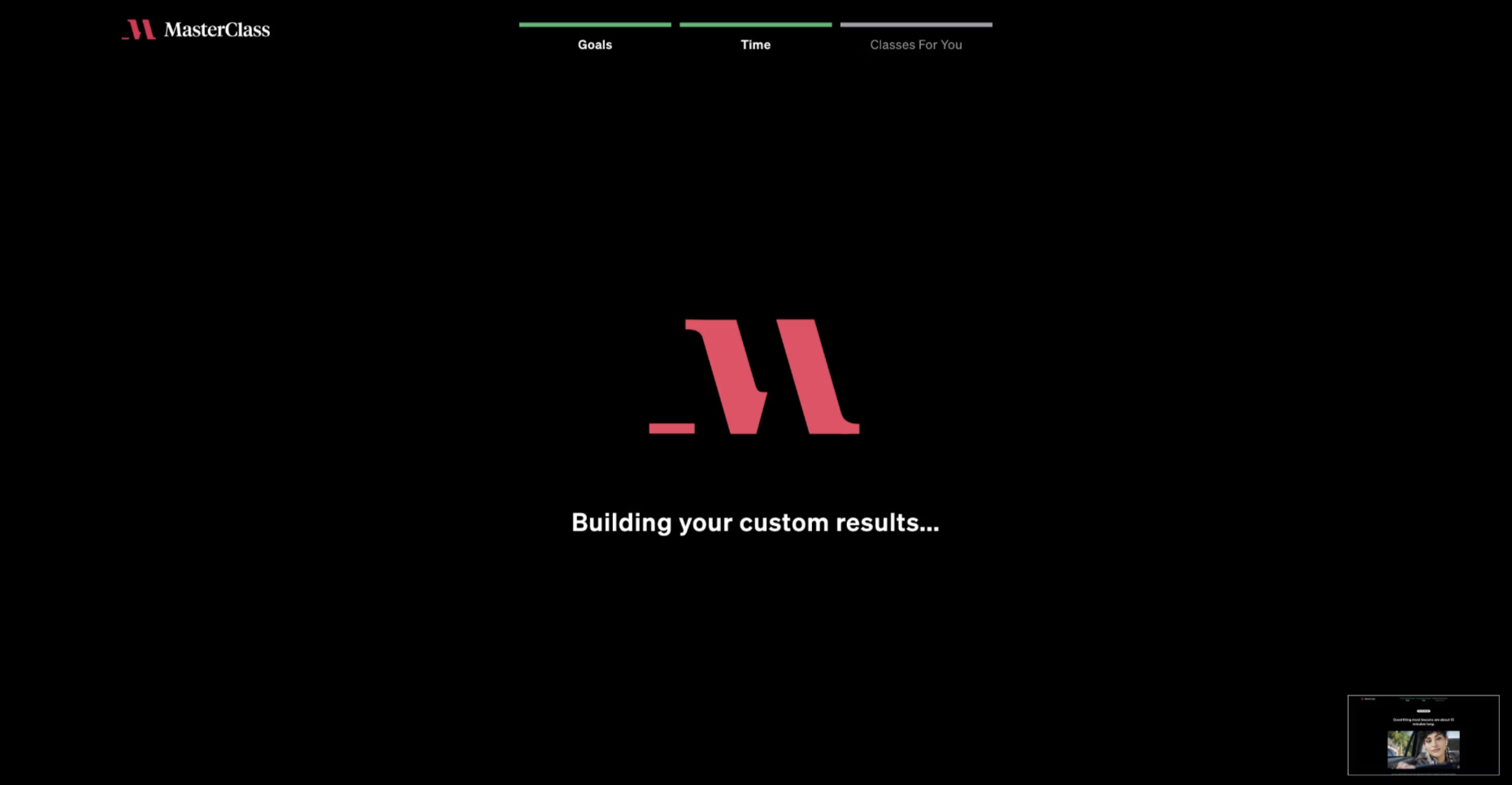 Masterclass goes even further. Even when you arrive from a paid Google ad, they don’t send you to a checkout page. They ask about your interests, build a personalized path of 36 classes (“Building your custom results…” appears on screen), and only then present the offer.