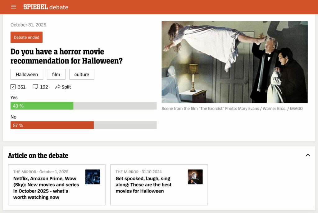 By separating the Debatte section from regular article comments, Der Spiegel established a clear “safe space” for discussion. Strict moderation ensures the conversation is constructive, focusing on the content (E.g. horror film recommendations) and not descending into trolling or hate speech.