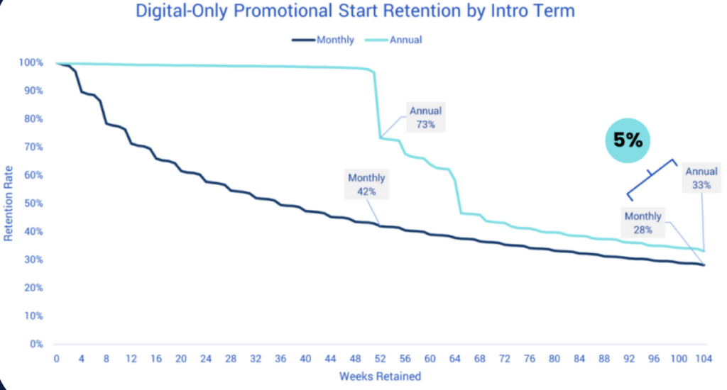Mather Economics’ benchmarks show that annual subscribers have better retention in the first year compared to monthly subscribers. However, by year two, the retention gap narrows to just 5%, indicating that the initial advantage of annual plans levels out over time.