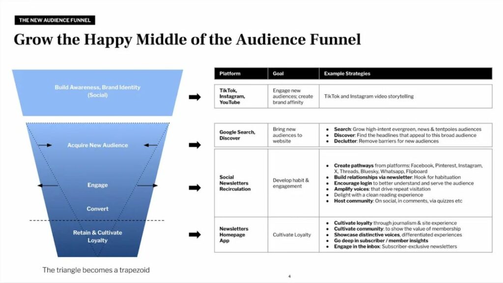 According to Sarah Marshall, VP, Audience Strategy at Condé Nast, who spoke at The Audiencers’ Festival this June thanks to an invitation from WordPress VIP, the focus should be on cultivating the “happy middle”. We should turn the audience funnel from an inverted triangle (wide top, narrow bottom) into an inverted trapezoid (wider middle).