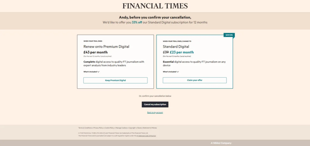 I recently went around benchmarking a handful of cancellation journeys (apologies to your retention team, I’m not helping your churn rates!) to help you to find a balance between retaining subscribers, and allowing them to leave easily. You can read through my findings here, but one thing I noticed with FT’s unsubscription journey was this slightly confusing step presenting alternative offers: