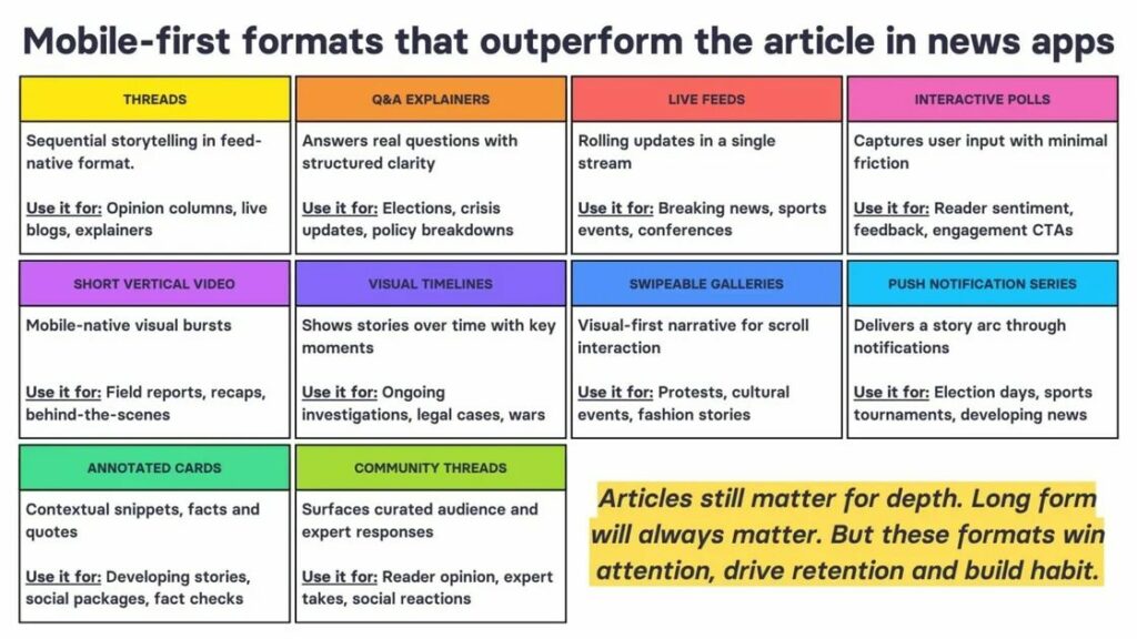 To reflect behavioral shifts in how users consume content, leading publishers are exploring a new set of formats – deliberate editorial structures designed to capture interest, reduce friction and guide users through complex stories in more natural ways.