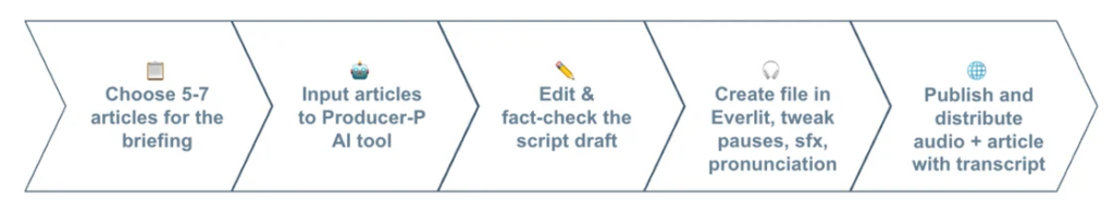 > Perfect the AI prompt: Don’t settle for simple article summaries. Dedicate time to perfecting the audio script prompt to generate an output specifically “intended for listening.” The script needs a different structure than written news.