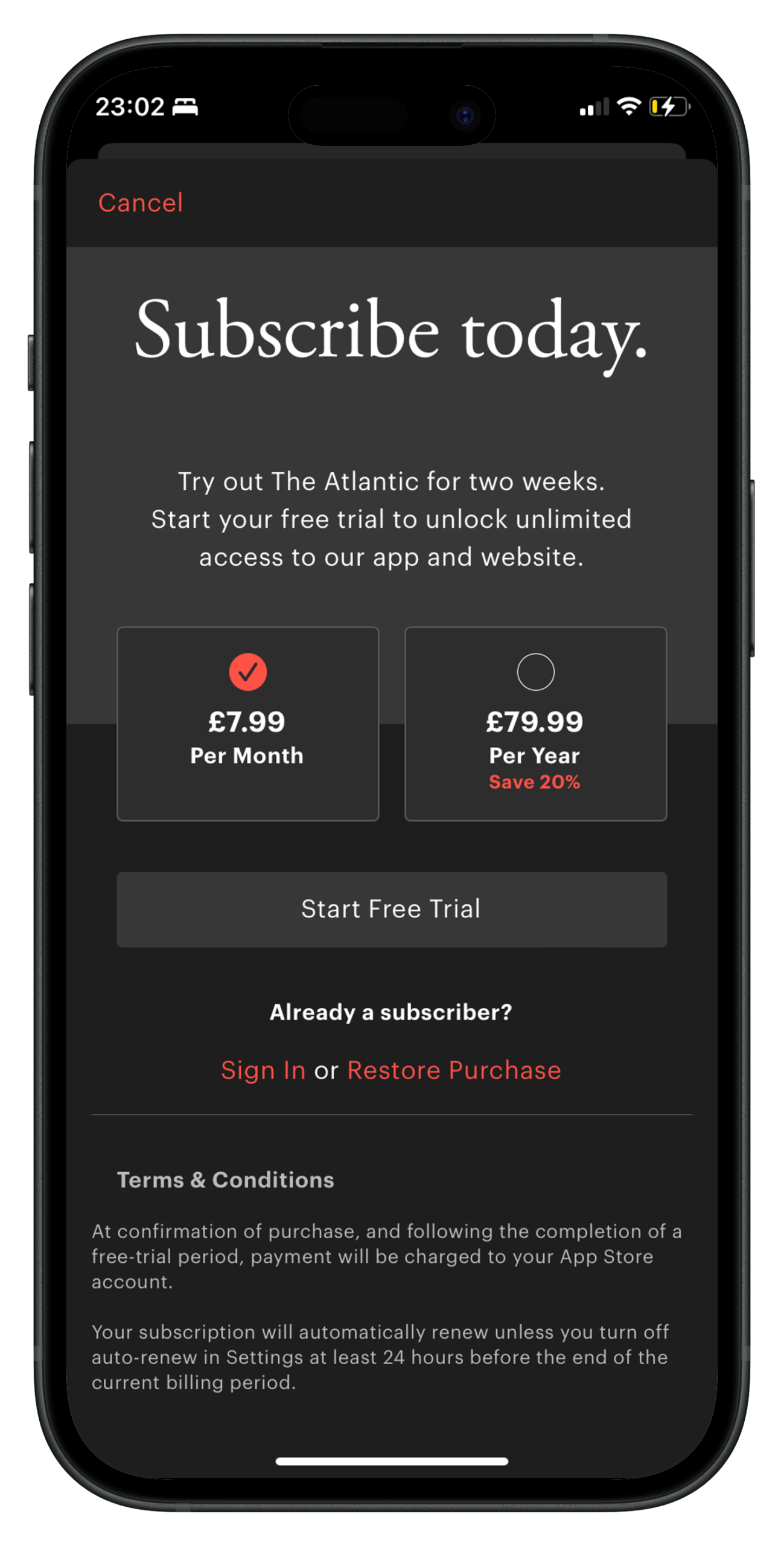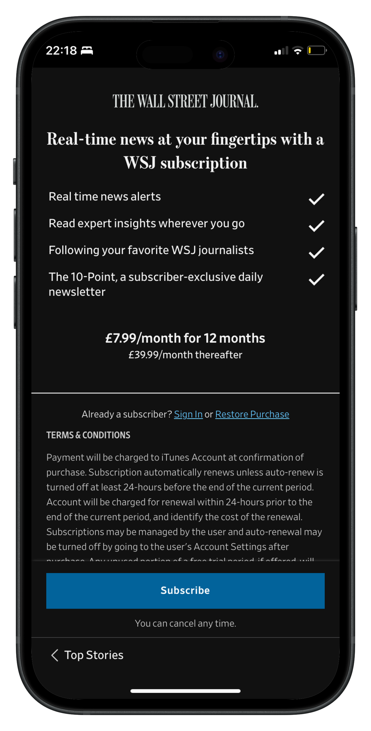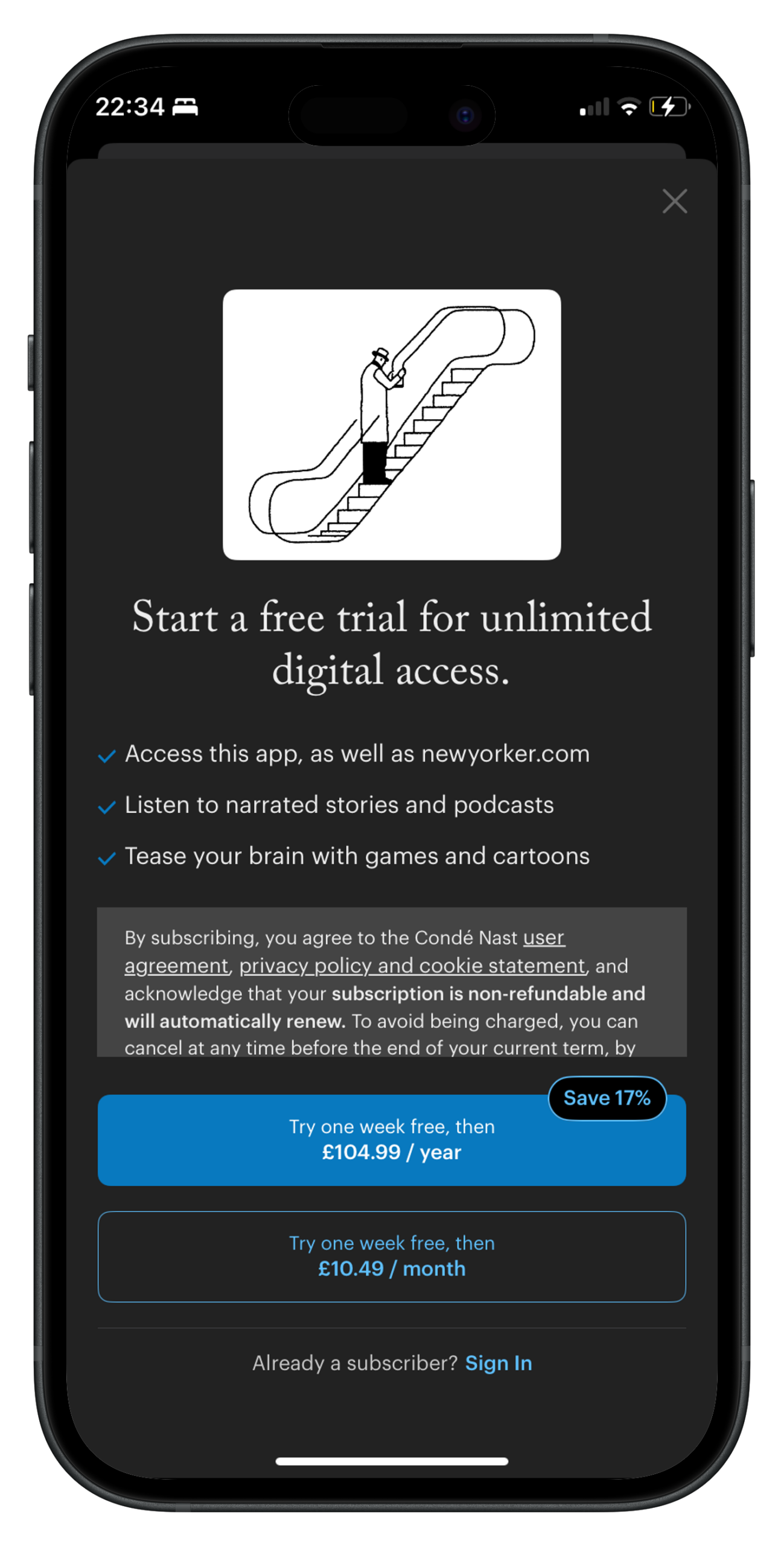 In the majority of these examples, a free or reduced trial offer is promoted, which isn’t always the case on desktop. Why? Likely because conversion rates across the industry are significantly lower on mobile than on desktop (for a variety of reasons, some of which I discuss here). For this reason, the goal of these publishers is to increase engagement on app, forming habits and encouraging the reader to activate notifications amongst other UX features that keep bringing them back to read more. After having completed the free trial and onboarding, they’re highly more likely to continue their subscription.