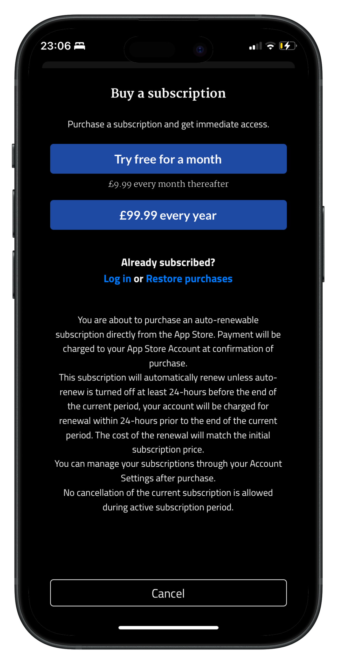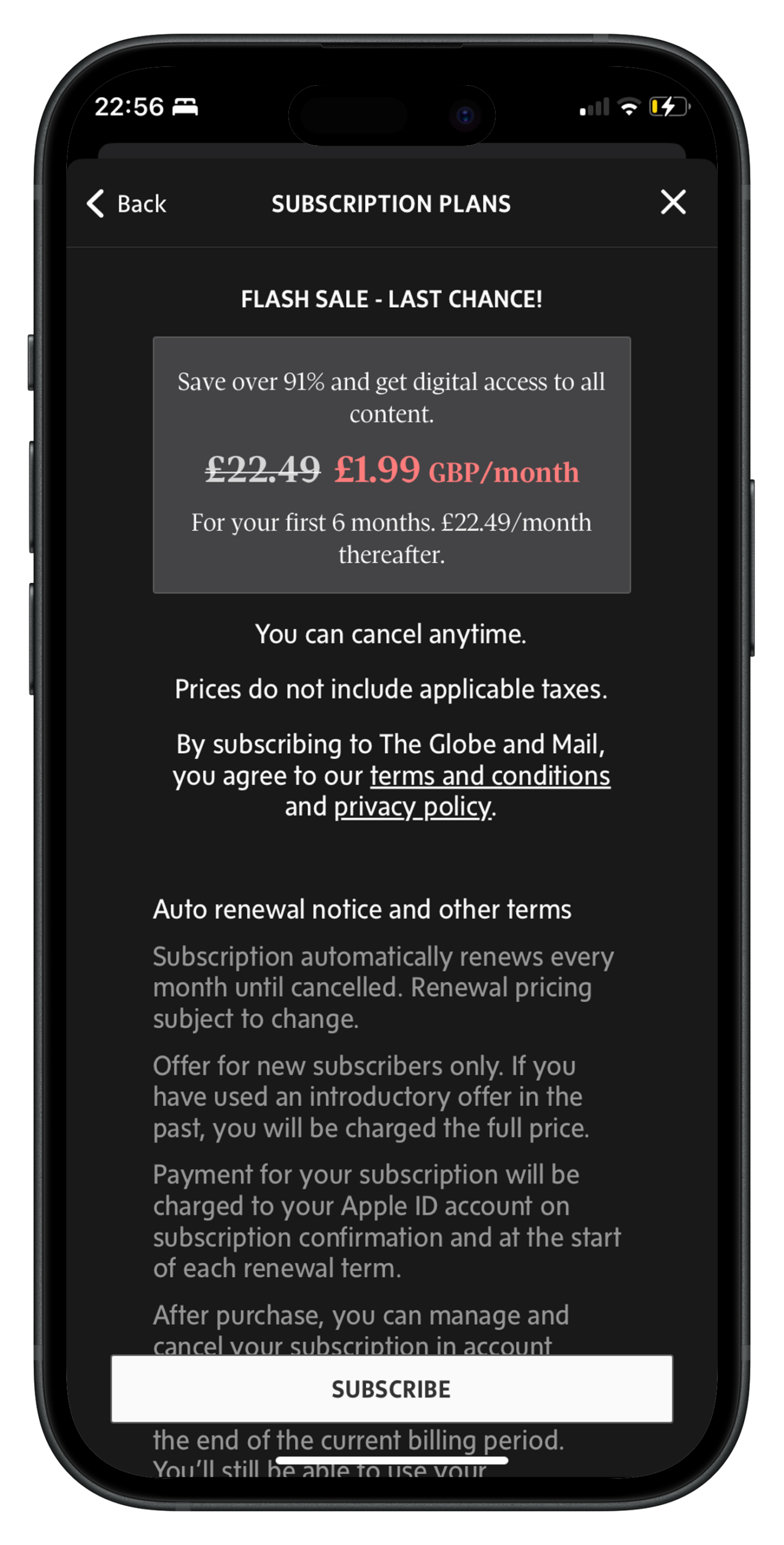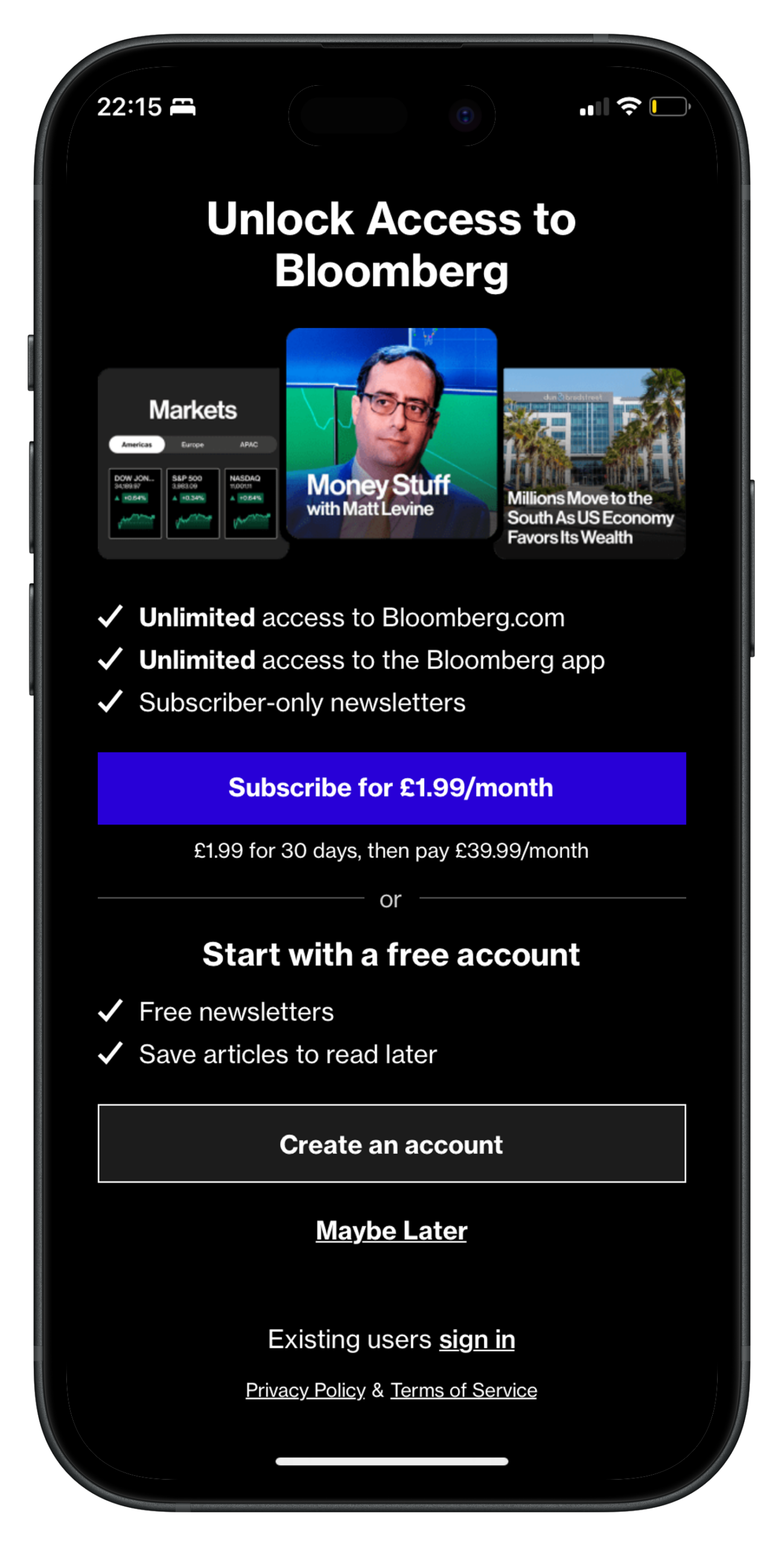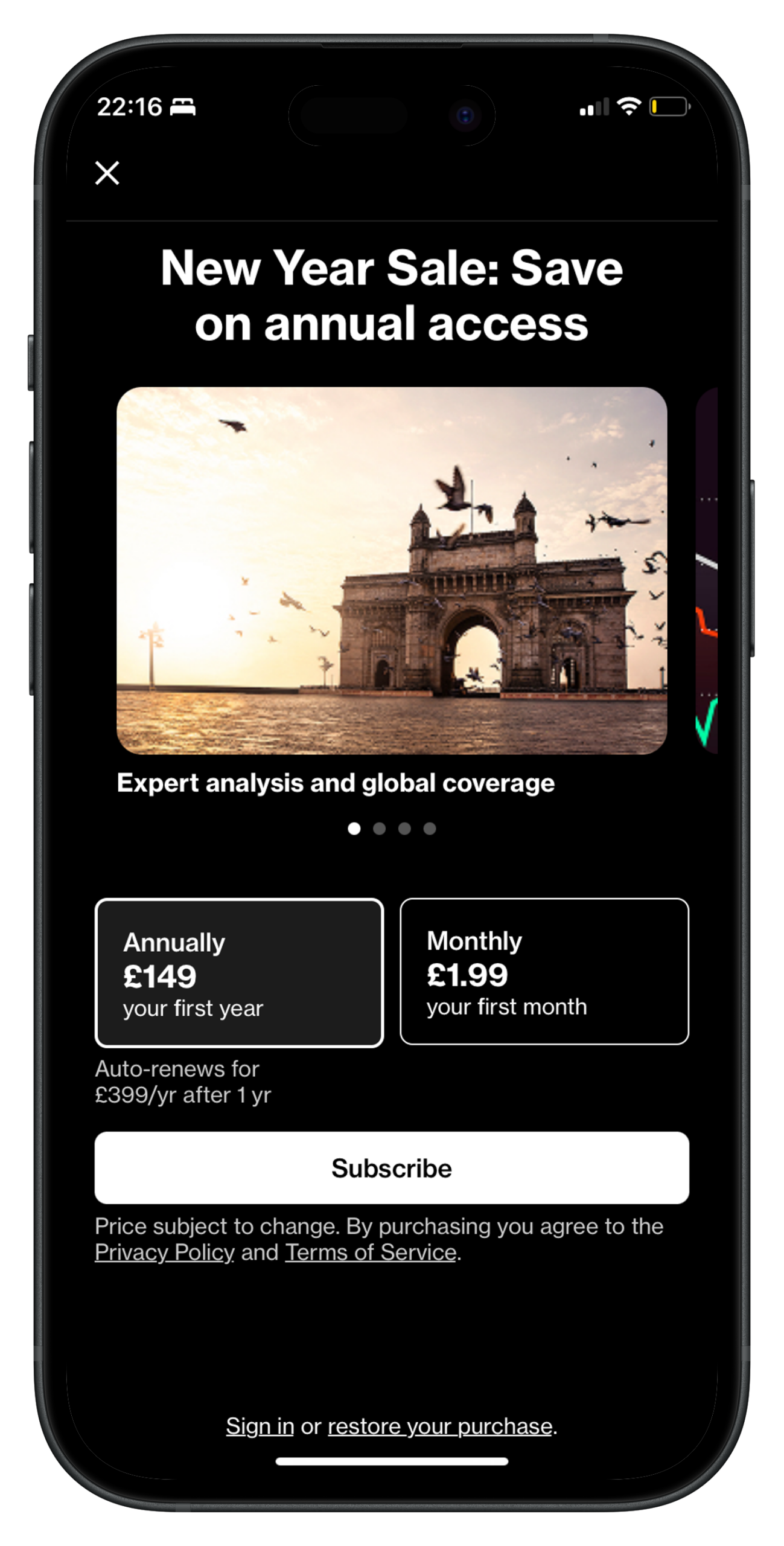 In the majority of these examples, a free or reduced trial offer is promoted, which isn’t always the case on desktop. Why? Likely because conversion rates across the industry are significantly lower on mobile than on desktop (for a variety of reasons, some of which I discuss here). For this reason, the goal of these publishers is to increase engagement on app, forming habits and encouraging the reader to activate notifications amongst other UX features that keep bringing them back to read more. After having completed the free trial and onboarding, they’re highly more likely to continue their subscription.