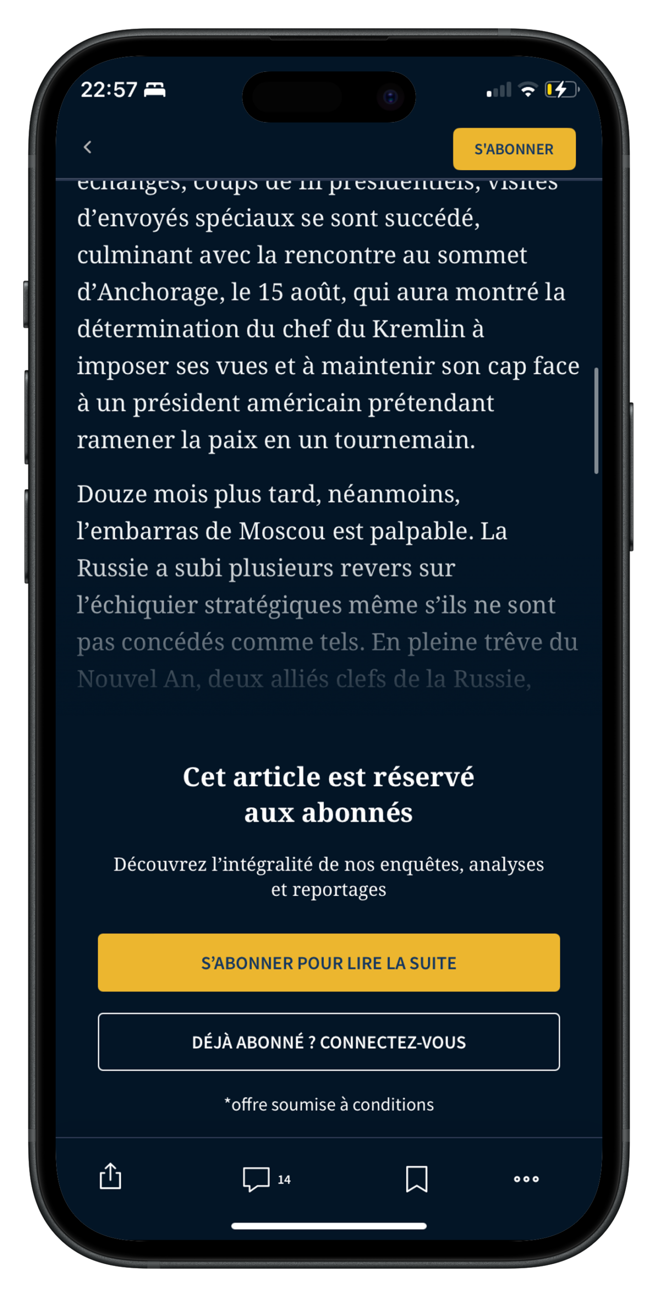 Le Monde has a unique technique of hiding half of the paywall, allowing readers to reveal the subscription benefits by clicking on the arrow.