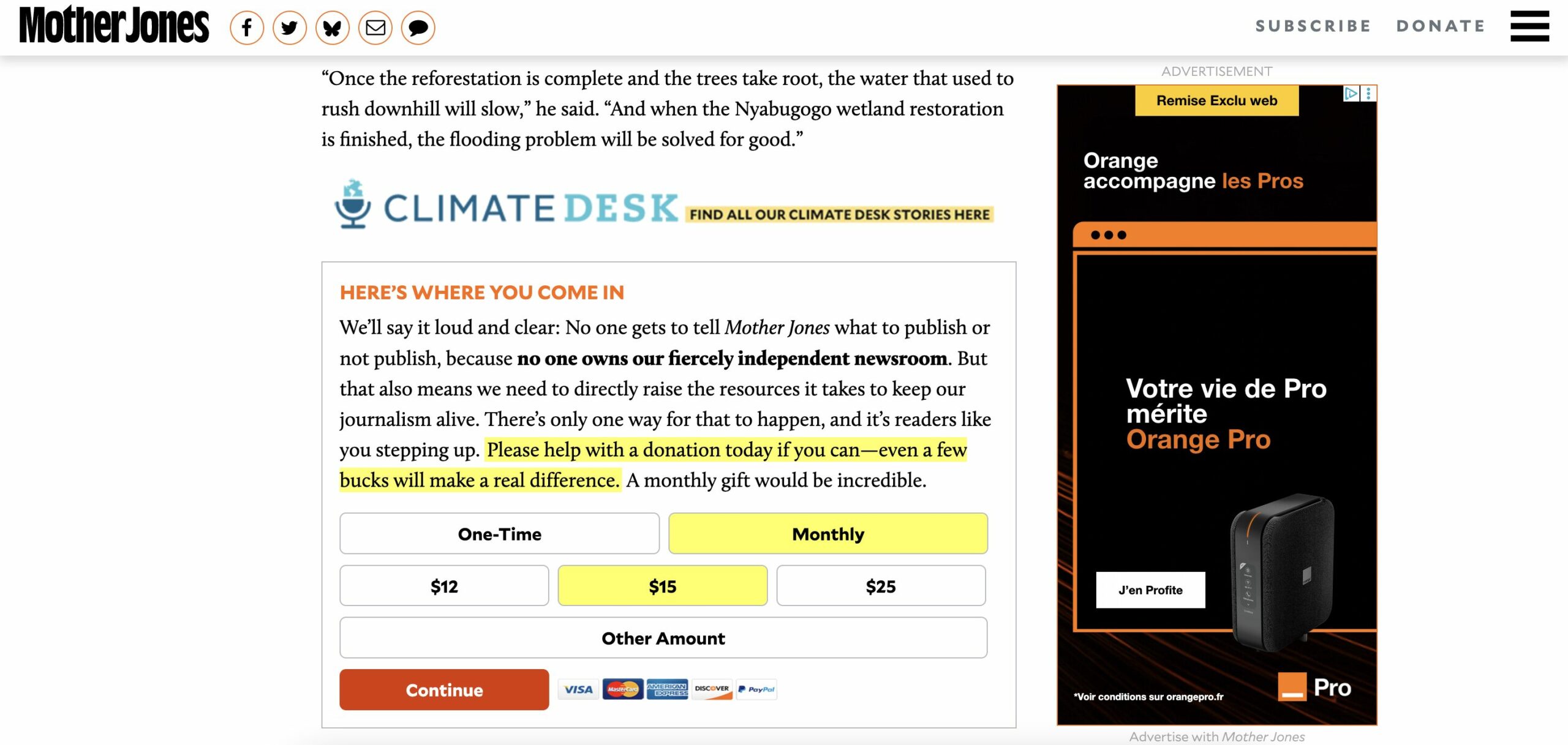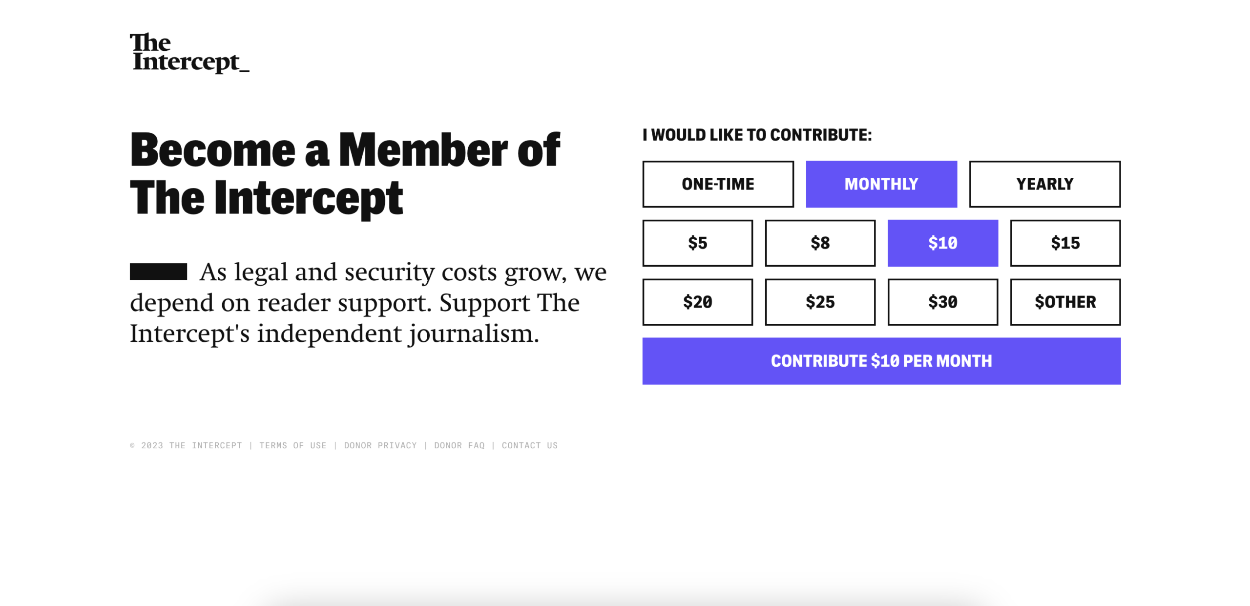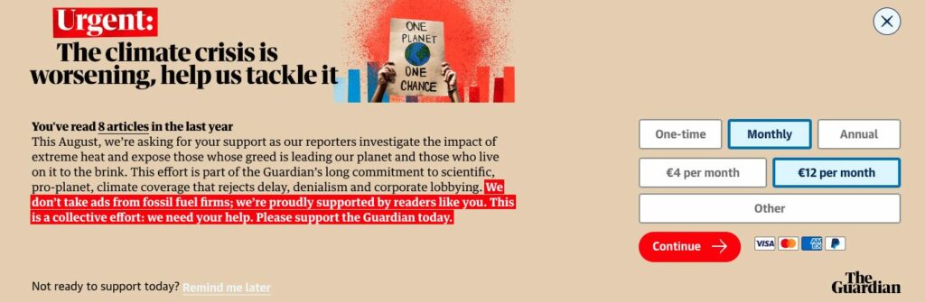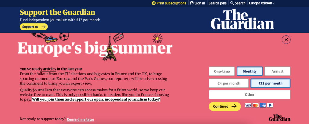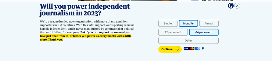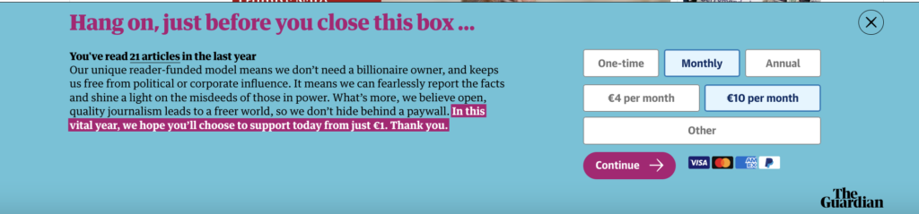 Whilst donation models revolve around voluntary support and often don’t involve blocking content with a paywall, this doesn’t take away from the need for dedicated landing pages as well as banners, pop-ups or closable walls to gain financial support.
