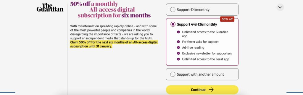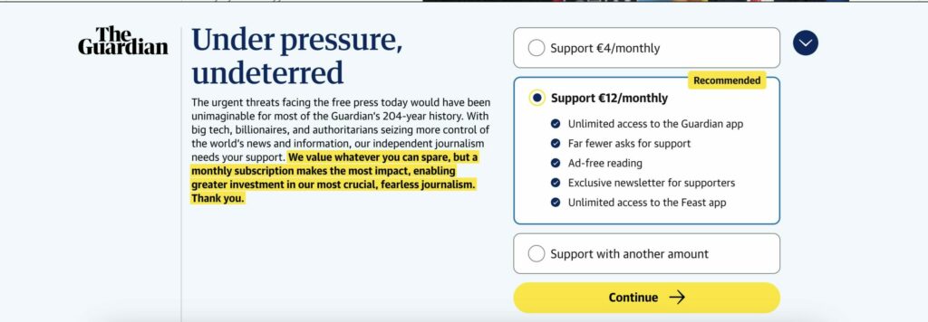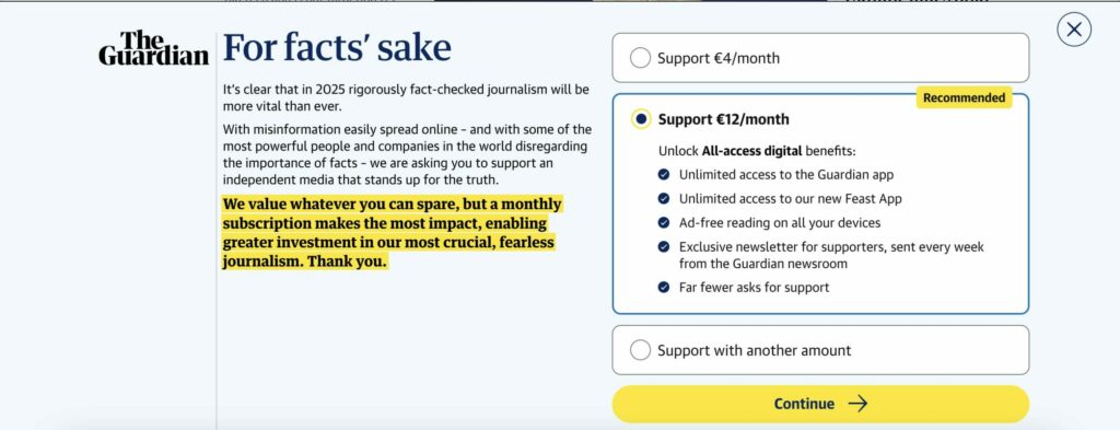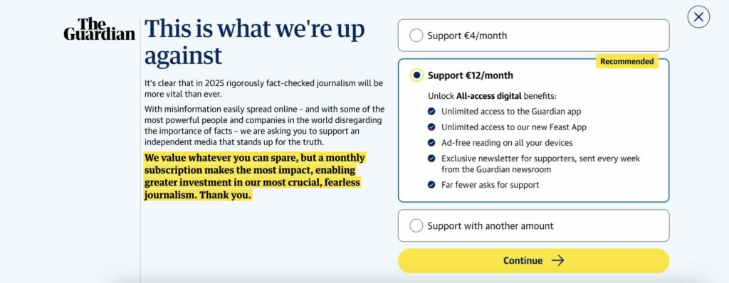 In particular, below the main benchmarks, we’ve shared a variety of examples from The Guardian, the British publisher who is widely recognized for their success in a donation model. What works particularly well for them is their work on continuously changing and testing the messaging on promotional modules, adapting to news cycles and key moments in their readers’ diary. You can read more about how they’ve developed their proposition over the years in this summary from our London Festival in 2024.