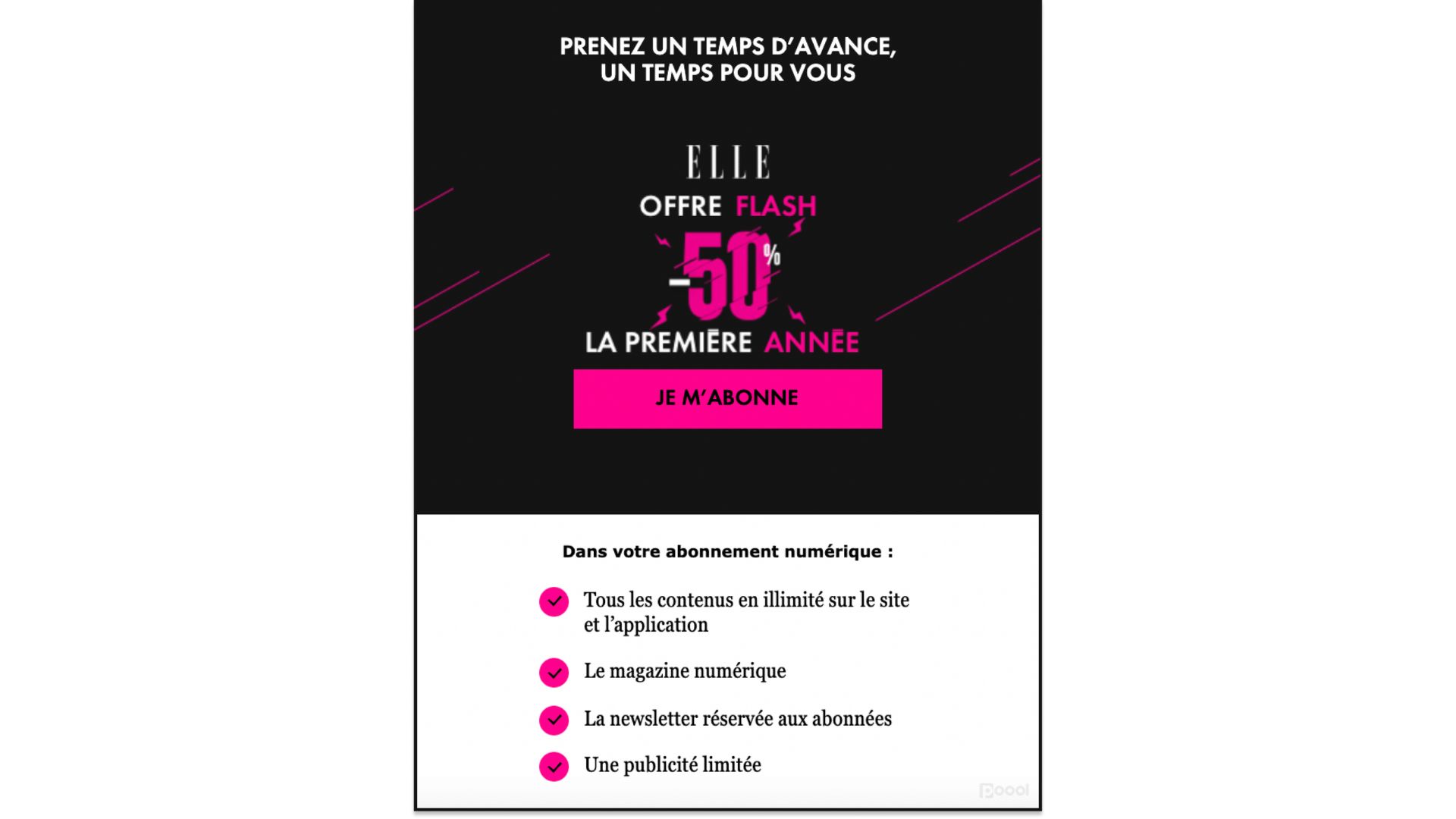 - Use this opportunity to mix up your paywall design, reducing paywall blindness. ELLE France’s wall has very similar text to their classic paywall but the simple change of colors ensures that the wall continues to be noticed by readers