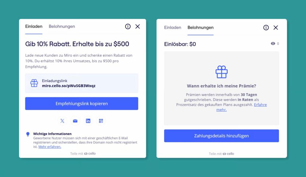A referral program can reduce this risk: The bonus doesn’t have to be paid out as a fixed amount at the start, but is distributed monthly as long as the referred user remains a subscriber. In Miro’s example, as the referrer, I receive 10% of the ongoing subscription fees. When the referred subscription ends, my bonus also ends. This eliminates the risk of spending more on a customer than you earn from them.