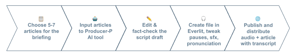 For the production side, we were already using a tool called Everlite, which we used to create audio versions of our articles for accessibility. We worked with Everlite to see if we could adapt their tool to handle a multi-story audio briefing, adding features like pauses and sound effects. This has been very effective and allowed us to benefit from an existing tool while adding our own workflow around it.