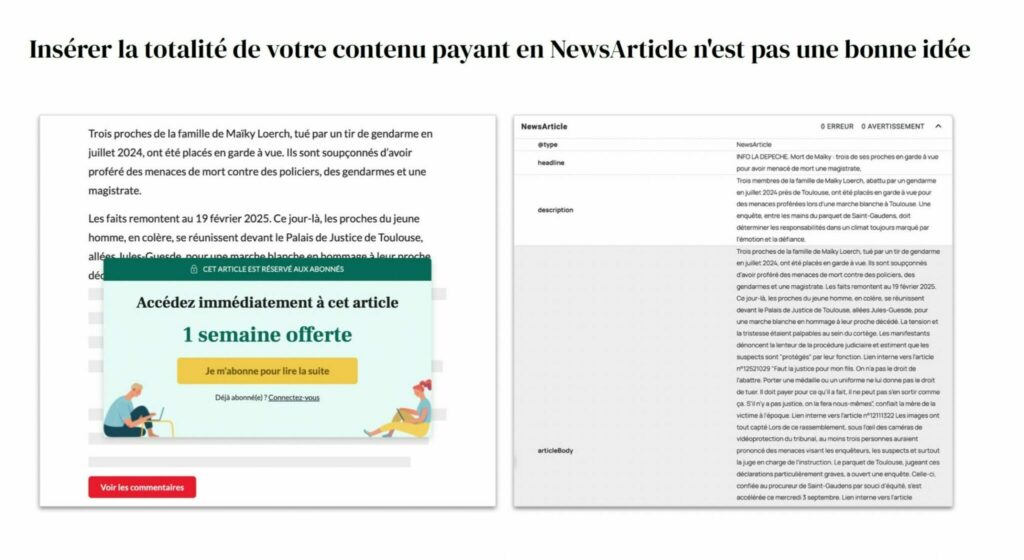 The text before the paywall: Google considers that below 800 characters, a page is “thin content,” and below 1,200 characters, it is of average quality. On the other hand, the more you give, the less you convert. Each media outlet must therefore find its balance between SEO and conversion—ideally through A/B testing.