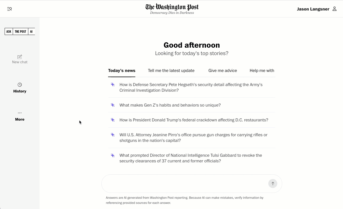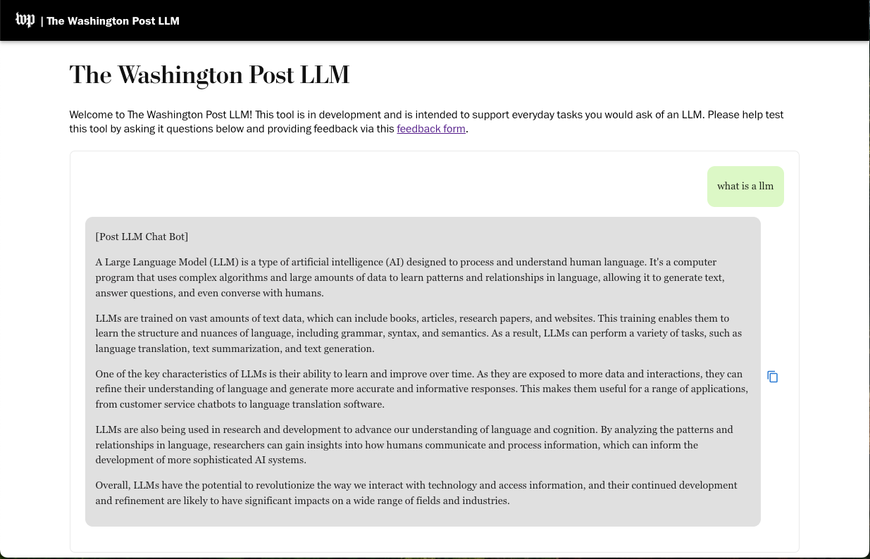Ask The Post AI continues to evolve and improve with every question our readers ask. User research and feedback allows us to improve and tailor how it responds. For instance, we work hard to establish when the LLM should make clear to readers that there isn’t sufficient Post coverage to offer a solid answer. Additionally, we’re working towards where and how Ask The Post is contextually available — such as recent experimentation to add the tool on some articles. And as we iterate for external needs, the AI Pod R&D lab supports internal customers — leaning into our own tooling as creators and as staff users before we make features available externally to Post subscribers and users.