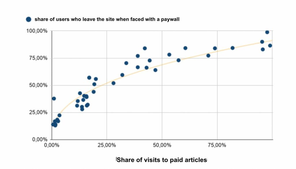 And the other side of the coin is just as important: the DMR also showed a strong correlation between traffic on paid articles and the share of users who simply leave the site when hitting a paywall. The more you frustrate, the more people bounce. That’s not just a missed conversion. That’s a direct hit on engagement, on page views, ad revenue, and your ability to build any relationship with that user.