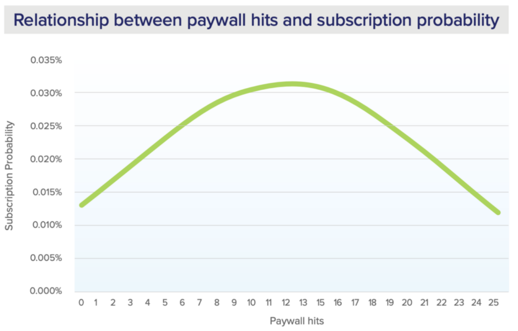In the same year, Mather Economics published a study (part of a GNI LatAm Subscriptions Lab report) looking at paywall hits per user. Subscription probability follows a bell curve: up with each hit, peaks, then back down. Same conclusion, different data.