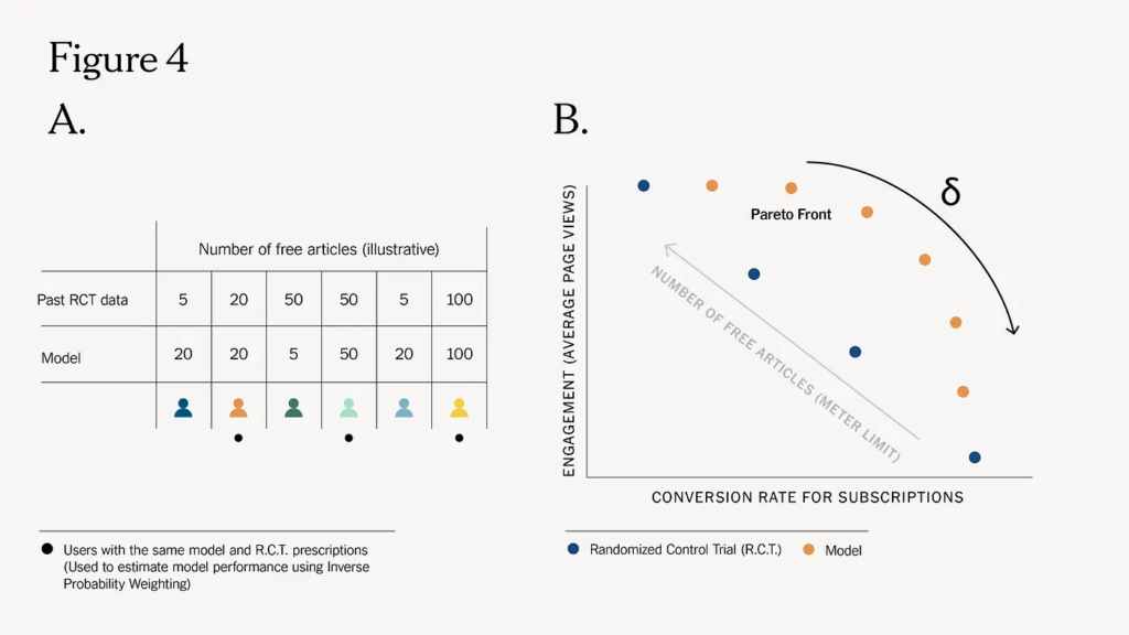 The NYT does it with the Dynamic Meter (as we talked about earlier). It learns from first-party engagement data (no demographic or psychographic features), adjusts per user, and continuously runs randomized trials to improve. This is the model that expanded the opportunity window we described above (source).
